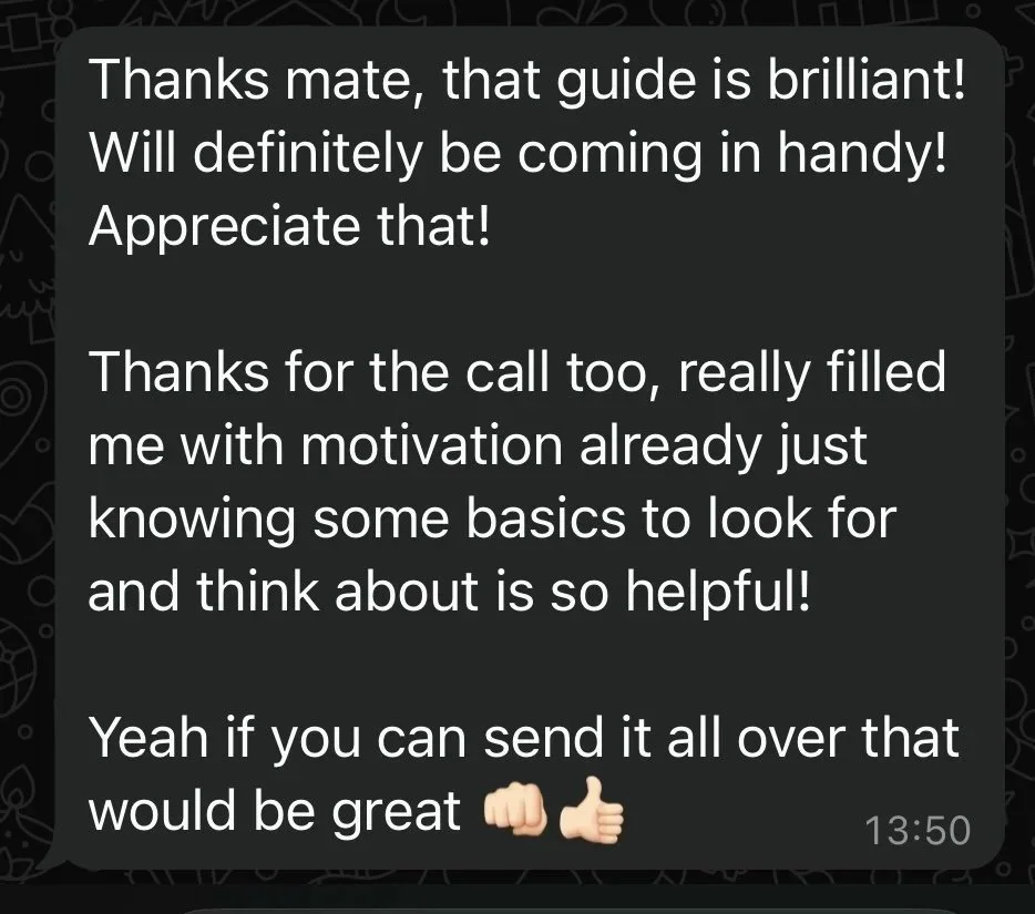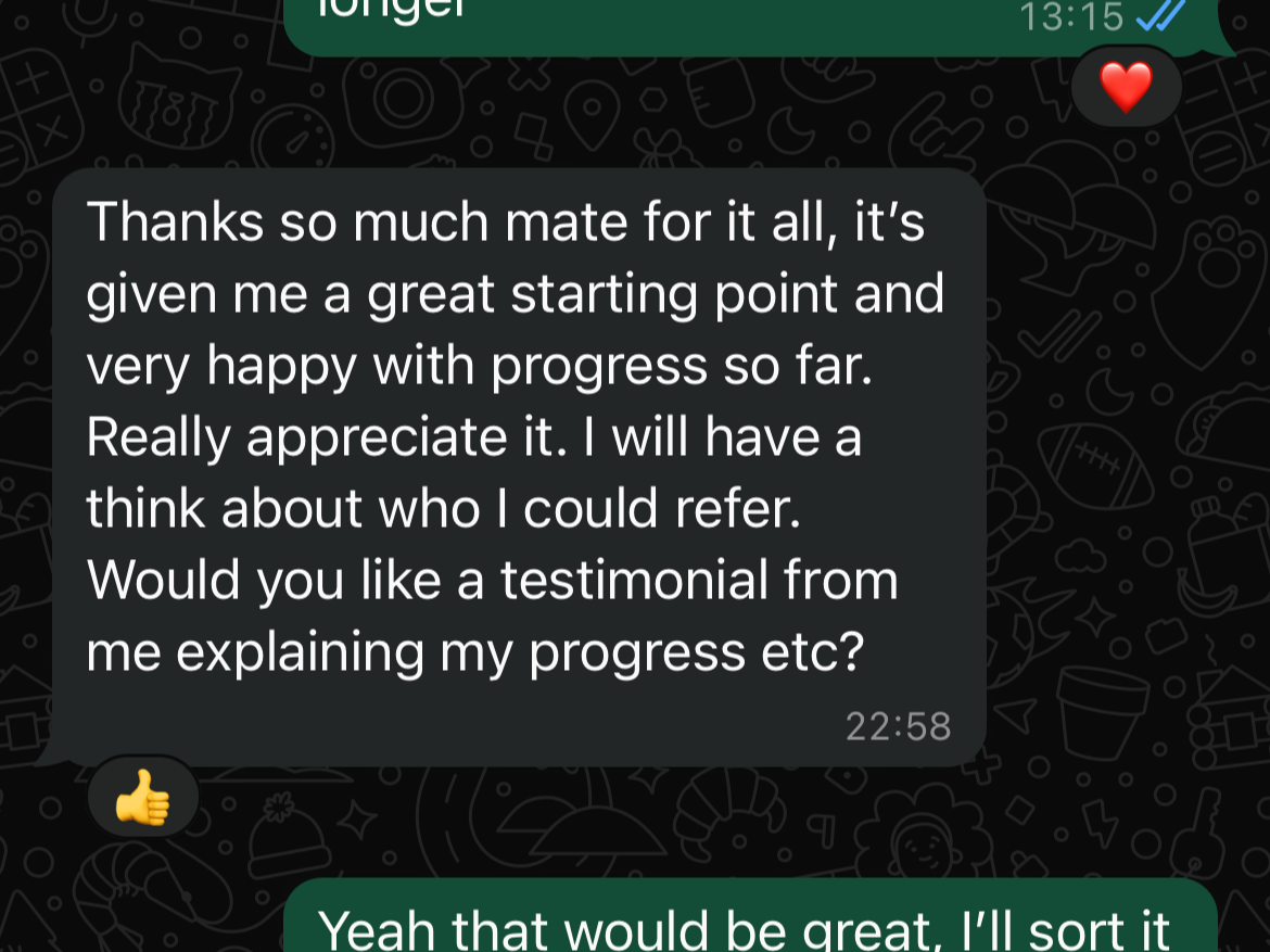 Ongoing WhatsApp support for questions, reassurance, and course-correction when things don’t go to plan. You’re not left guessing or Googling your way through it.